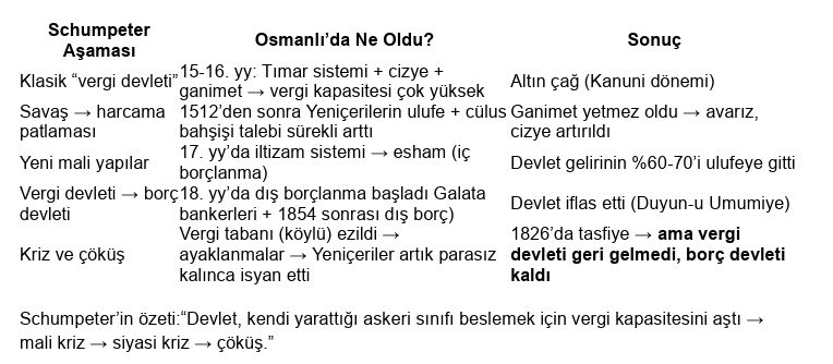 Schumpeter’in özeti:“Devlet, kendi yarattığı askeri sınıfı beslemek için vergi kapasitesini aştı → mali kriz → siyasi kriz → çöküş.”