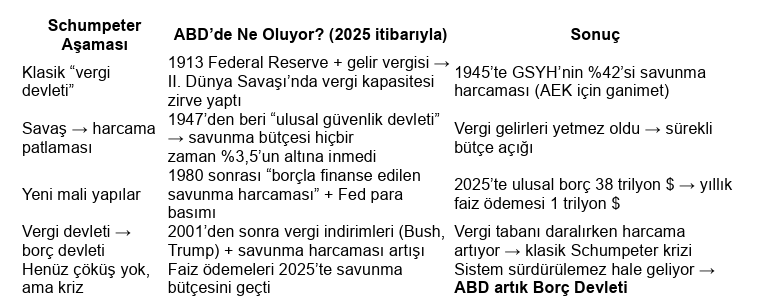 Schumpeter’in ABD için 2025 yorumu ne olurdu? “Amerika, vergi devletinden tamamen borç devletine geçti. Askeri-endüstriyel kompleks, Osmanlı Yeniçerileri gibi, devletin vergi kapasitesini aşan bir harcama kalemi haline geldi. Borç devleti, bir süre daha ayakta kalabilir (çünkü dolar rezerv para), ama mali kriz er ya da geç siyasi krize dönüşür. Ya AEK radikal bir şekilde tasfiye edilecek (Amerikan Vaka-i Hayriyesi), ya da sistem yavaş yavaş çürüyecek ve Roma/Osmanlı gibi çökecek.” İkisinde de aynı cümle geçerli: “Devlet, kendi yarattığı canavarı artık besleyemiyor.” Trump yönetiminin maliyeti müttefiklere (NATO, Avrupa, Körfez, Japonya, G.Kore vd) yayma çabası, ekonomiye son bir refleksle verilen can suyudur.