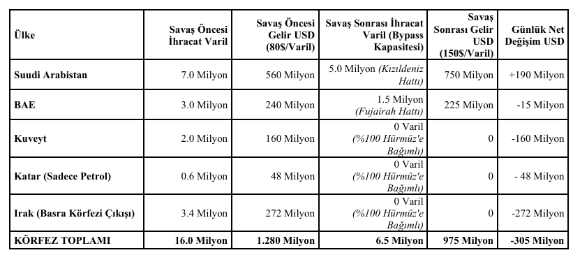 Aşağıdaki tablo, Savaş Öncesi (Tahmini 80 dolar/Varil) ile Savaş Sonrası (Tahmini 150 dolar/Varil) günlük petrol ihracat gelirlerini, ülkelerin sahip olduğu lojistik "bypass" (Hürmüz'ü aşan boru hatları) kapasitelerine göre karşılaştırmaktadır.
