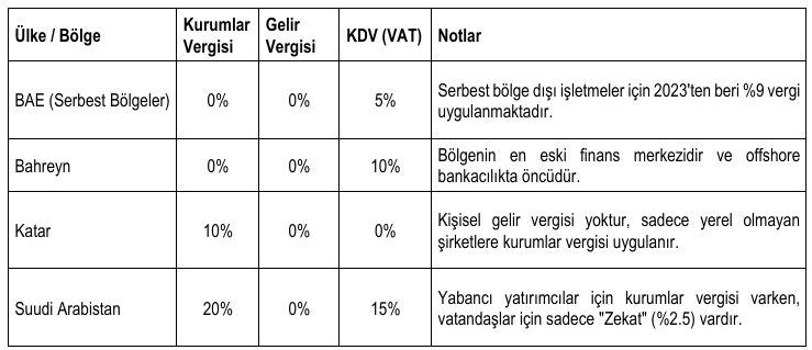 Vergi Avantajları: Körfez ülkeleri, kurumlar vergisi ve gelir vergisi konusundaki "hafif" yaklaşımlarıyla bilinirler. Aşağıdaki tablo yatırımcılar için vergi avantajlarını göstermektedir.